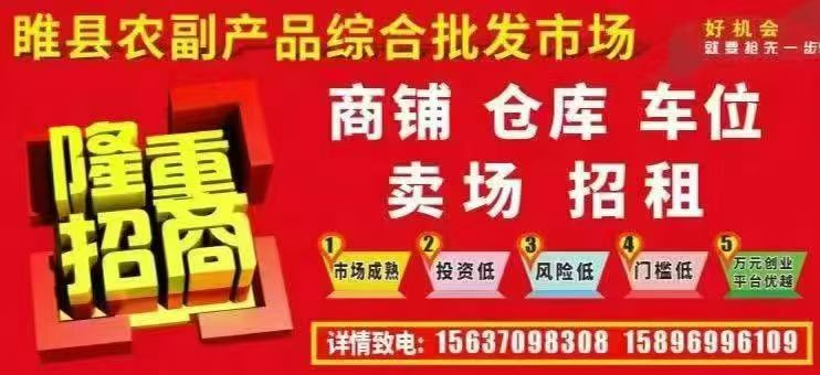 招商:万元创业,睢县农副产品综合批发市场,平台大,市场成熟,低投资,低风险,低门槛,是您在家创业的首选,详情:15637098308