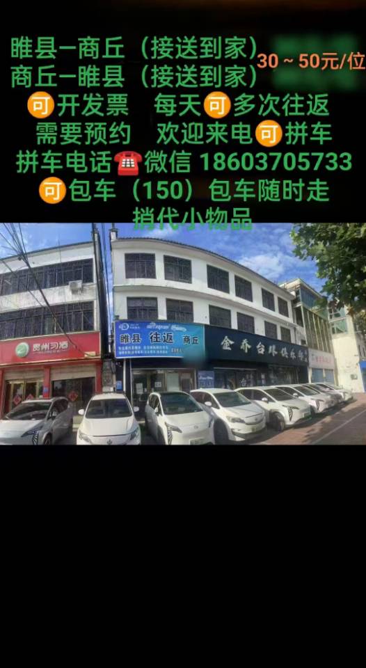 睢县—商丘/(接送到家)30~50元/位商丘—睢县/(接送到家)🉑开发票欢迎,拼车(每天多次往返)需要预约拼车电话☎️微信18603705733可🉑包车(150)包车随时走