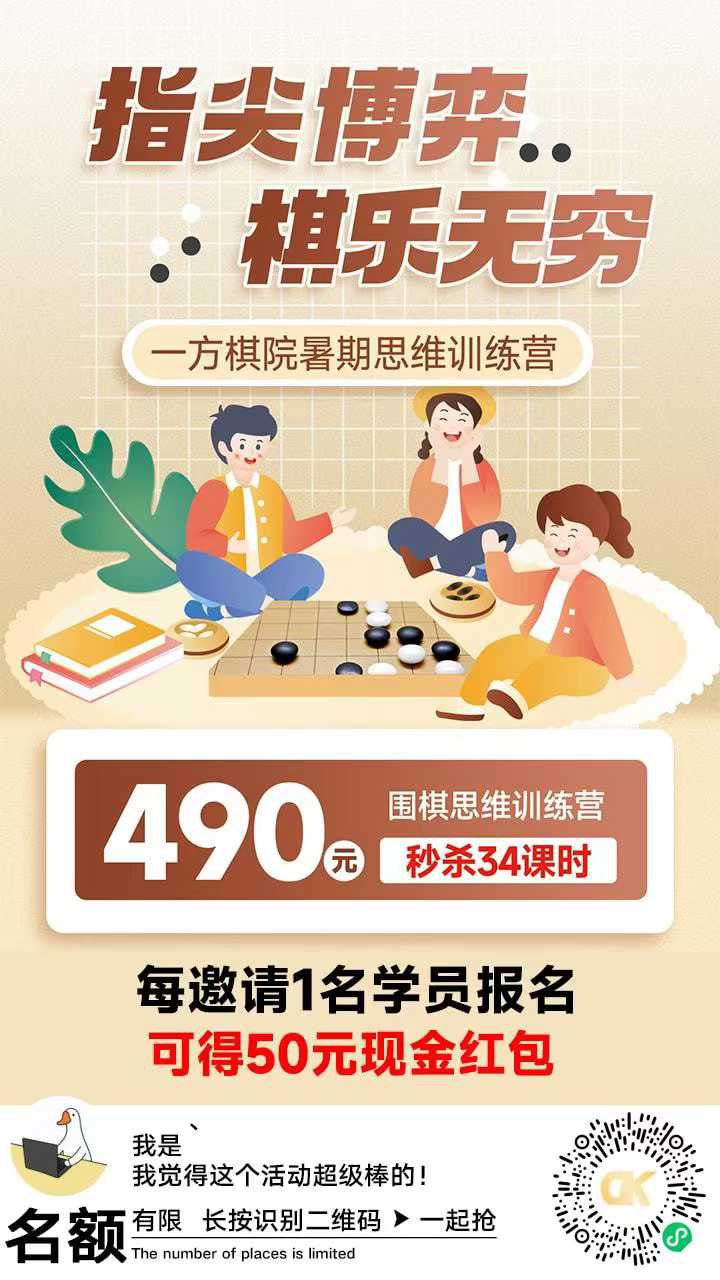 围棋暑假集训营……🎁前三十名赠品:1:送教材2:定制T恤3:定制手提包一个4:转发朋友圈加送棋具一套名额有限,先报先得,满班即止早报名早排班!后期不插班!☎️报名热线:15005392667